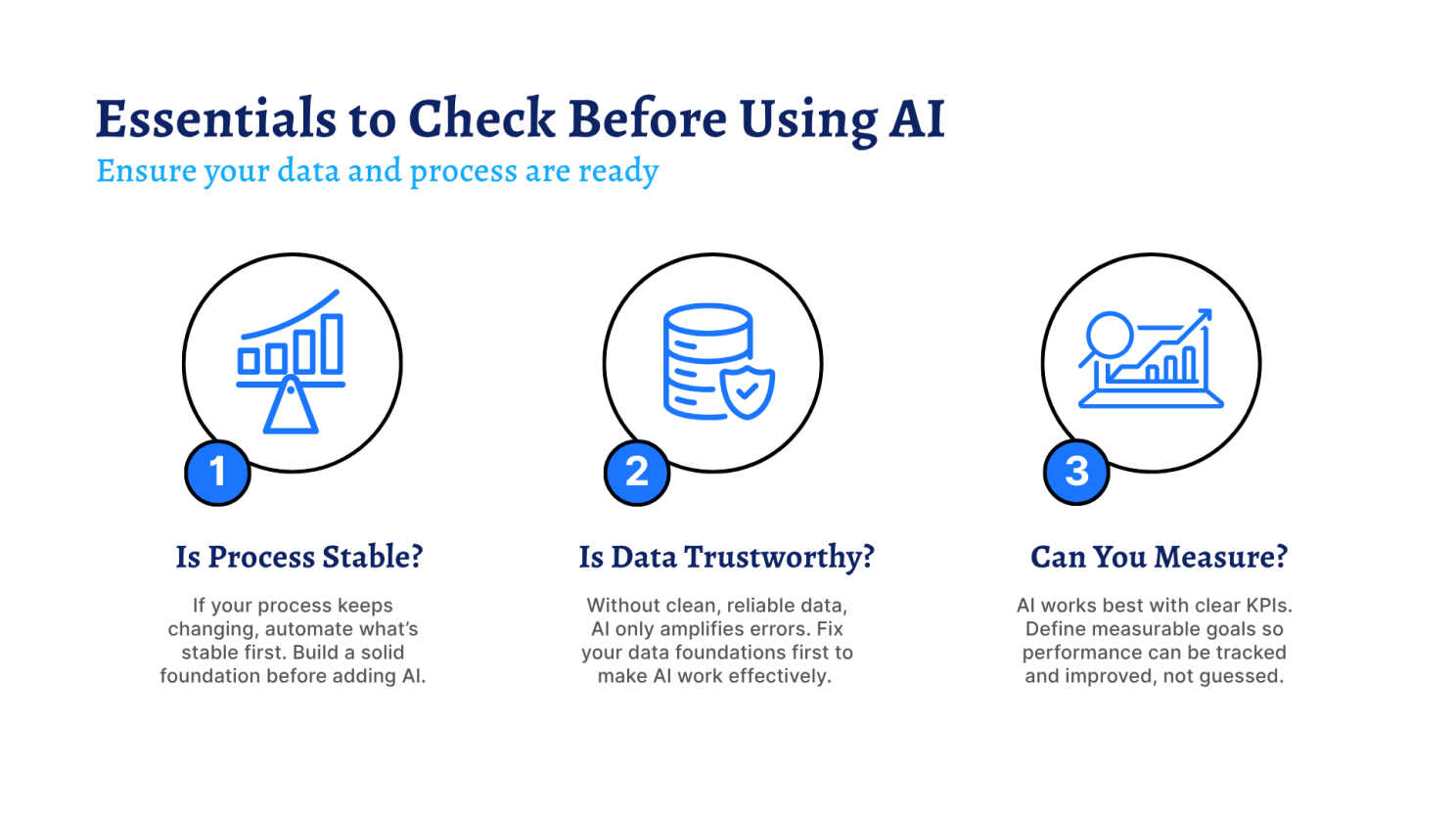 This maturity-first mindset helps prevent “shiny model” syndrome and ensures that when AI is introduced, it’s solving the right layer of complexity.