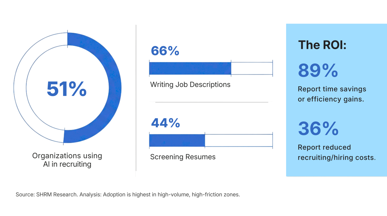 And among HR teams using AI in recruiting, 89% report time savings or efficiency gains, while 36% report reduced recruiting/interviewing/hiring costs.