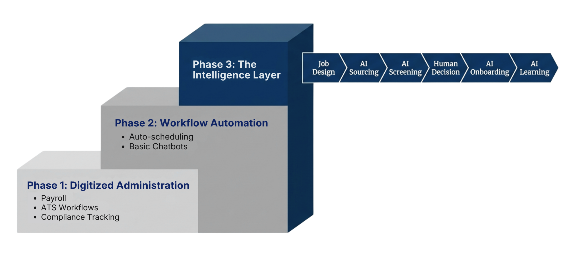 Job Design → AI Sourcing → AI Screening → Human Decision → AI Onboarding → AI Learning → AI Performance Signals